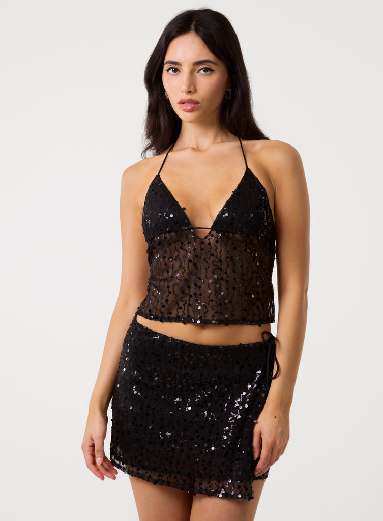 Enchant the crowd in this sexy and fun set. Pair this Sequin Tie Back Top with its matching Sequin Skort and get all eyes on you. Just throw on a fluffy coat for a dancefloor entrance to die for, babe.