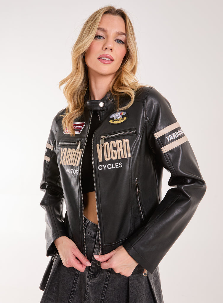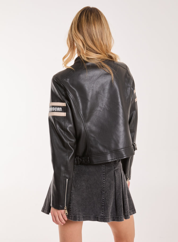 Bring all the cool vibes to your look with this Patch Mix Motocross Biker Jacket. Featuring a faux leather fabric, patch detailing and motocross style, Pink Vanilla helps you stay on trend season after season.