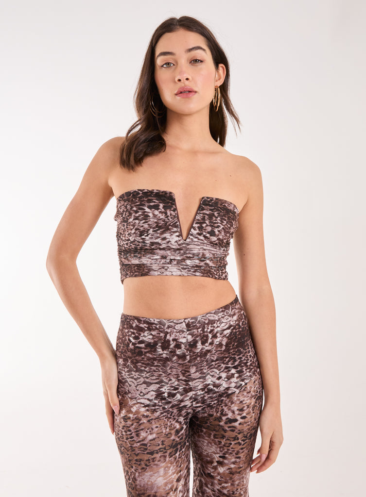 Step out looking fierce in this Leopard Lace Bandeau Top on a girl's night! Featuring a lace fabric and v hardware neckline, this top has it all.. Complete the look in our Leopard Lace Flares.