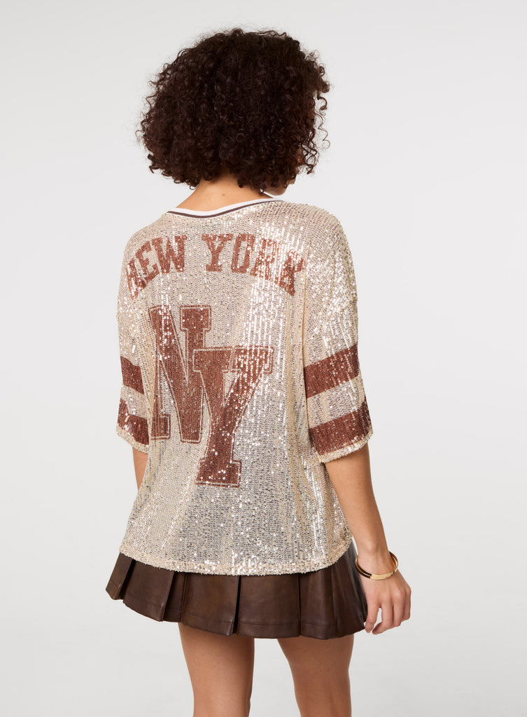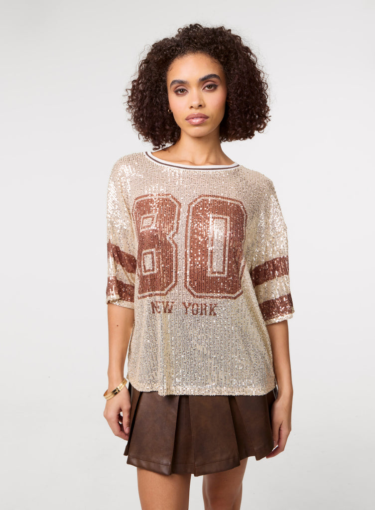 Our most trending piece of the season is now here for you in a whole sparkly way. Sporty girls, we're here for you. Style this LA Sequin Sport Jersey Top with a PU pleated skirt and knee high boots for a comfy yet viral look.