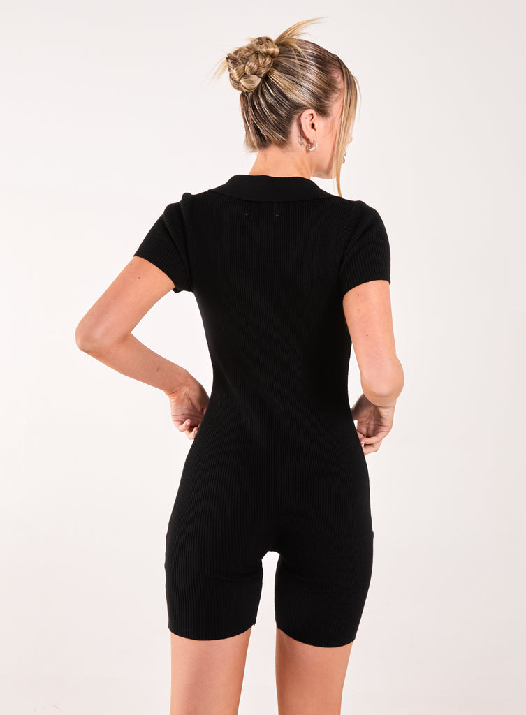 We are loving this black unitard. Featuring a half zip, collared neckline and figure hugging material for a look that will make you feel amazing! Pair with an oversized leather jacket, trainers and accessories for a perfect athleisure look.