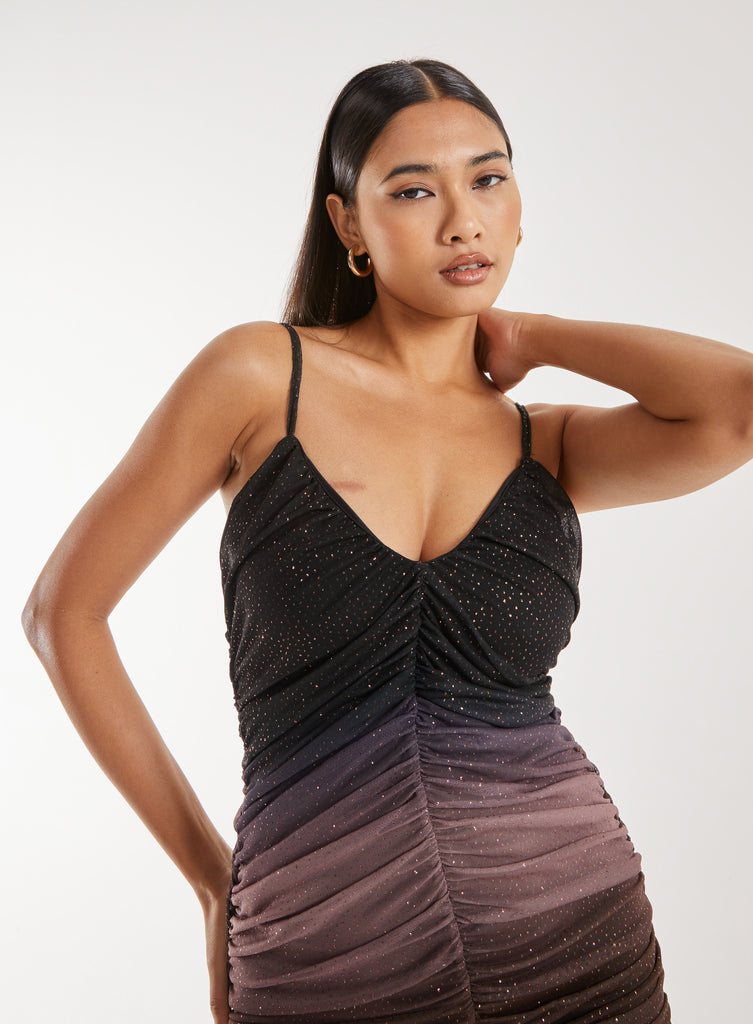 Streamline your curves with this figure-flattering Strappy Ruched Sparkle Ombre Mini Dress! Party-ready and all eyes will be on you!