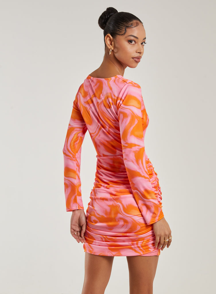 Marble Twist Long Sleeve Cut Out Ruched Mini Dress