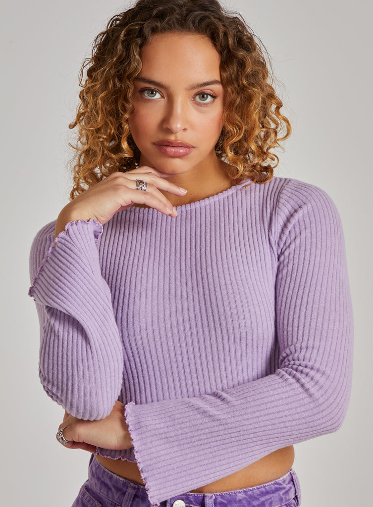 Soft Wide Brushed Ribbed Lettuce Hem Long Sleeve Top