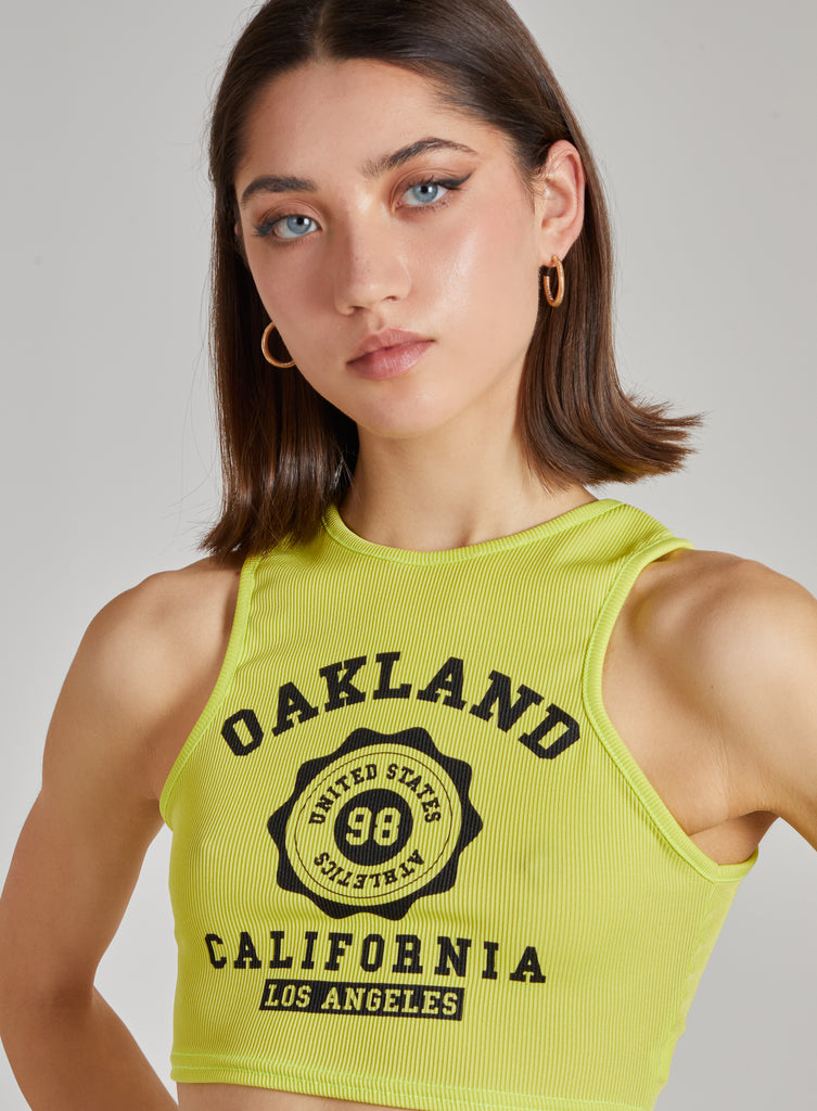 Add a little edge to your outfit of the day with this top. Featuring a ribbed material with a 'Oakland' print, what's not to love? Just add statement hue bottoms and fresh kicks for a chic, off-duty vibe.