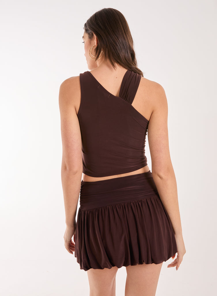 Style the colour of the season into your wardrobe with this top. Featuring a chocolate brown stretchy material, a one shoulder, a double layer and a cropped length. Pair it with our Slinky Puffball Mini Skirt.