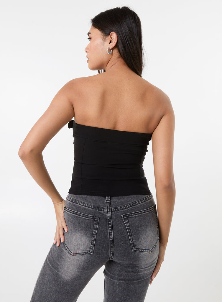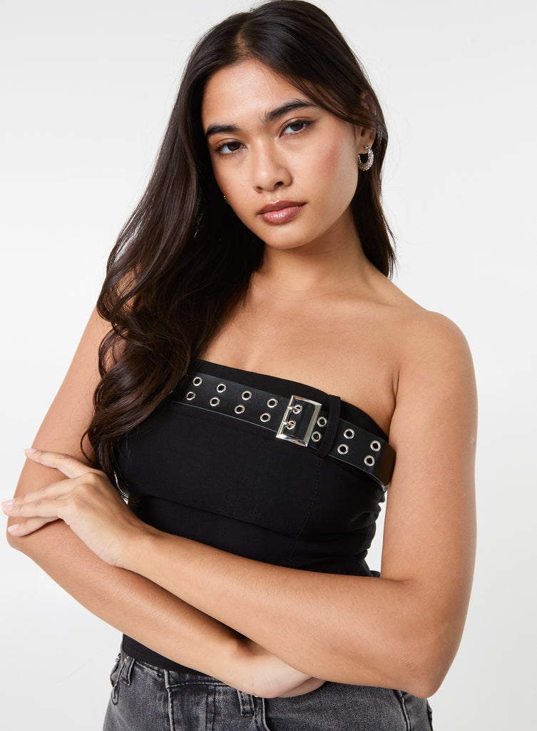 Add an edge to your weekend look with this black belted bandeau top. Style it with flare jeans or with our Belted Pleated Mini Skirt, heels and gold accessories for a look that is sure to turn heads.