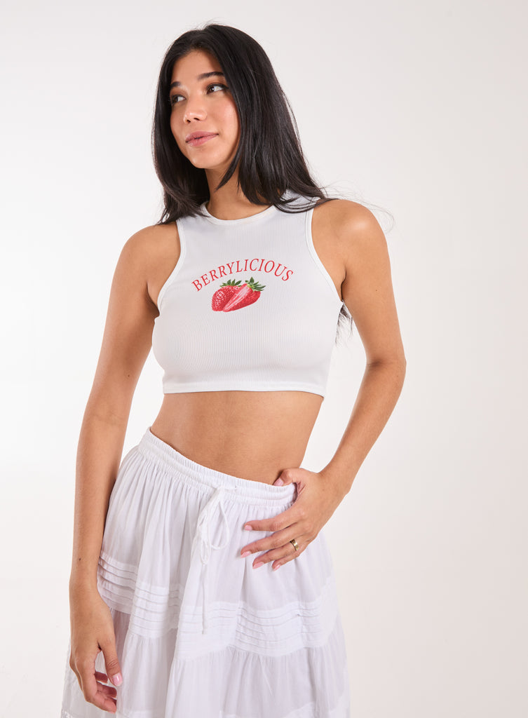 At Pink Vanilla we're in love with this strawberry crop top. Stay stylish and delicious by wearing with high waist denim cargo jeans and dad's trainers. Streetwear style approved!