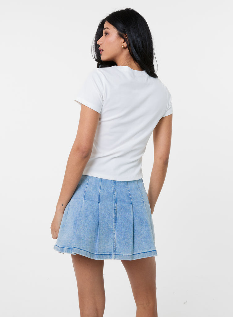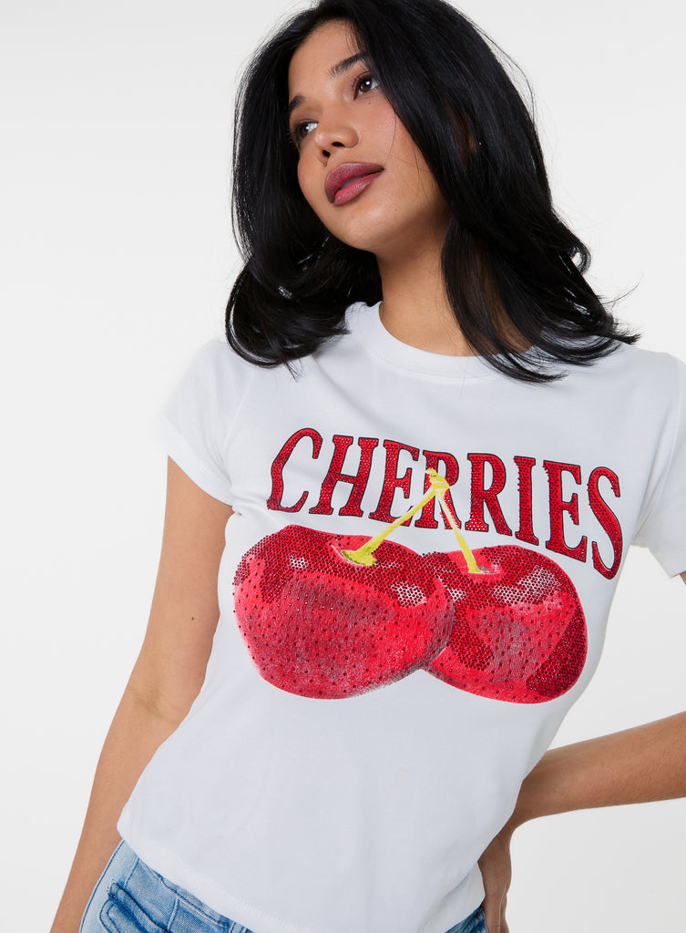 This white tee features a cherry design embellished with rhinestones to give a trendy boost to your everyday look.