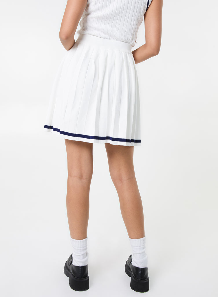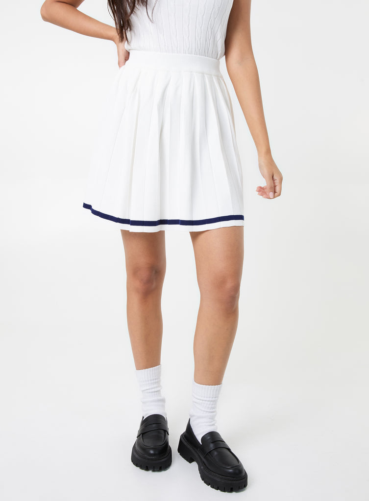 Hop on the preppy trend with this cute Pleated Mini Skirt With Contrast Binding. Perfect styled with an oversized jumper or paired with our Cable Knit Vest With Contrast Piping for a wholesome outfit. Chic and comfy!