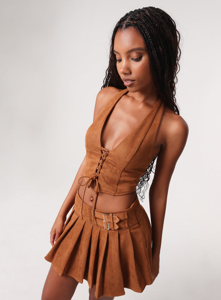 At Pink Vanilla, we're in love with this suede set. Perfect for transitional outfits, pair our Suedette Lace Halterneck Top with its matching Suedette Pleated Mini Skirt With Shorts for a full matchy-matchy 'fit. Complete the look with cowboy boots for the ultimate western vibe.