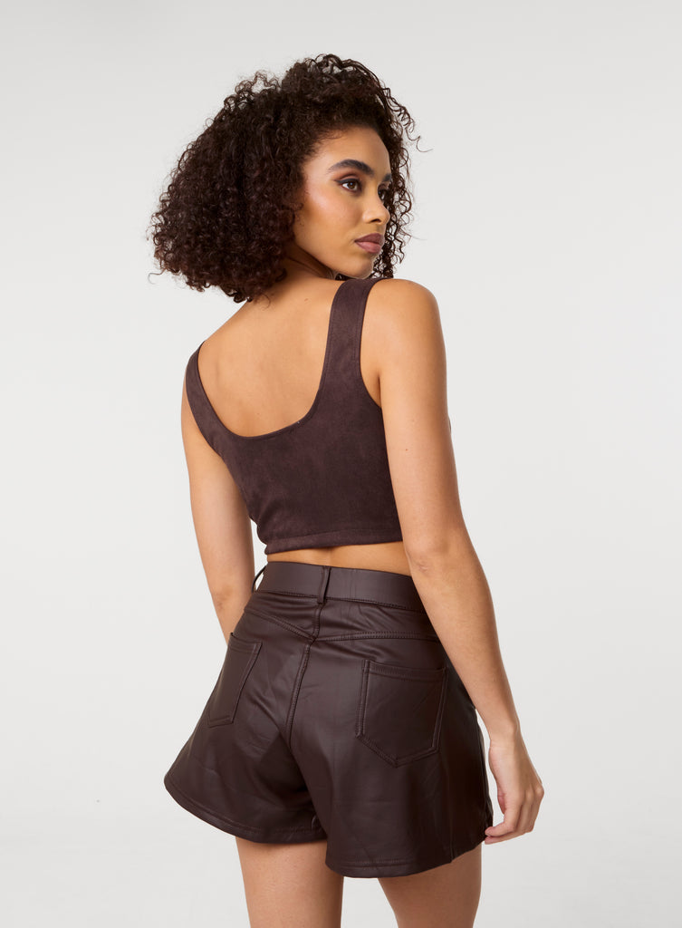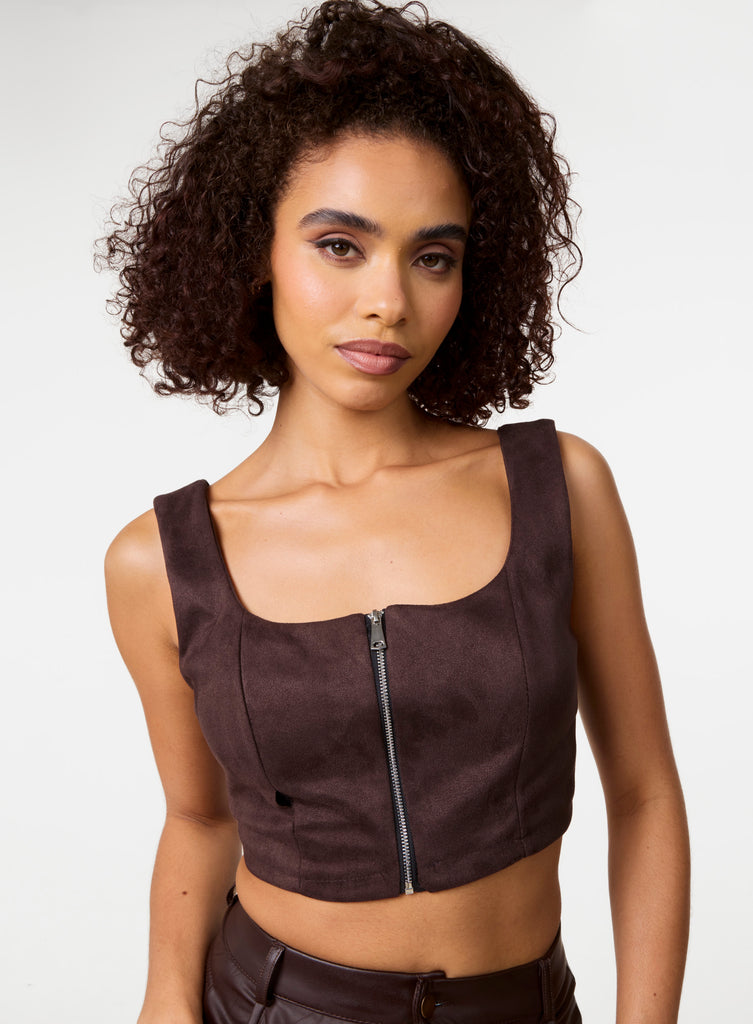 Wear it on its own or pair it with its matching Suede Skort Slit Skirt, this suede front zip top is a must-have this season.