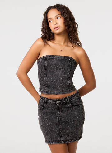 Sparkle this season with this super cool Diamante Denim Bandeau Top. Pair it with its matching Diamante Denim Mini Skirt for the ultimate partywear fit.