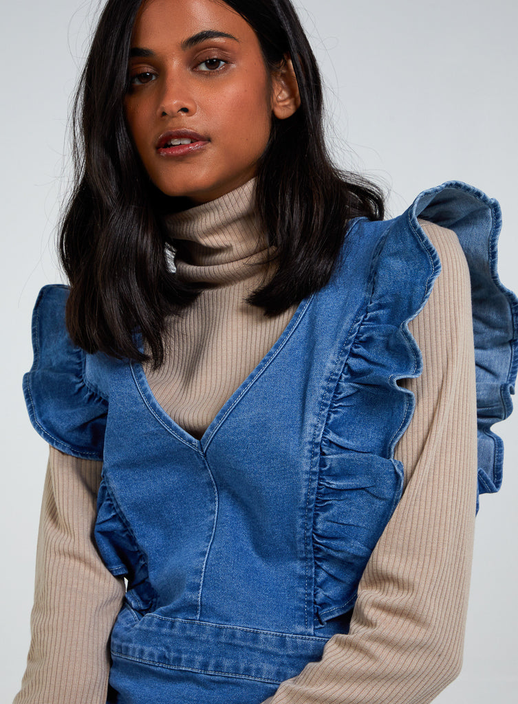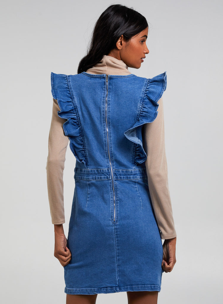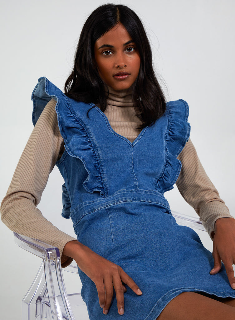 Frill Shoulder Denim Mini Dress