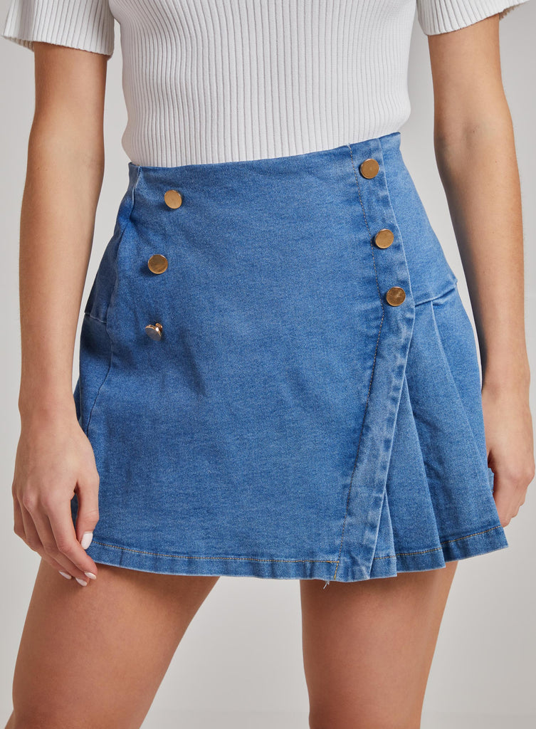 Pleated Button Detail Denim Skirt