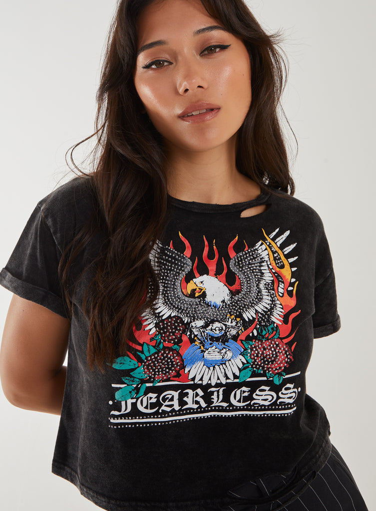 Rock'n'Roll never dies! So rock everyone's world with this Fearless Cropped T-Shirt, with a washed look and little diamantes to sparkle at your favourite band concert!