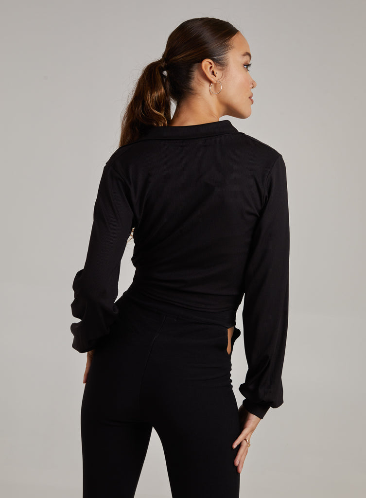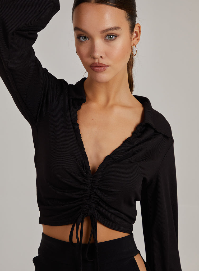 Ribbed Ruched Long Sleeve Collared Shirt