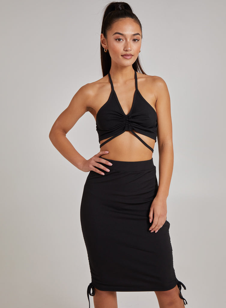 Flattering for every body shape, pair this ruched rop top, with it's matching ruched midi skirt for a fun filled look!