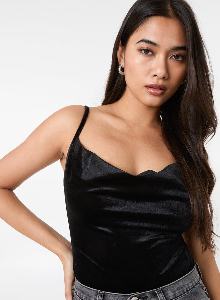 Want an insta-worthy Halloween 'fit? We've got you covered! This Velvet Cowl Neck Bodysuit is the ultimate 'Best Costume' winner. Pair with our Velvet Twist Front Midi Skirt and knee high boots for the slay of the season.