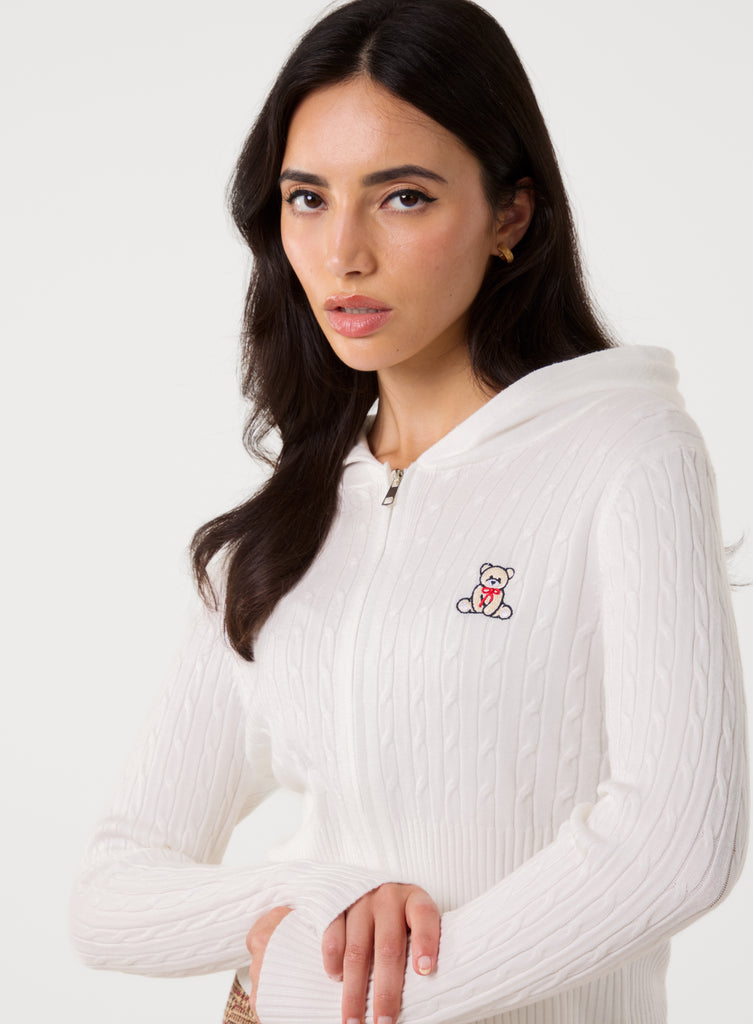 Add a little cuteness to your everyday look with this Cable Knit Bear Hoodie. Featuring a cable texture throughout, a zip fastening, and a lil embroidered bear, this hoodie checks all the boxes.