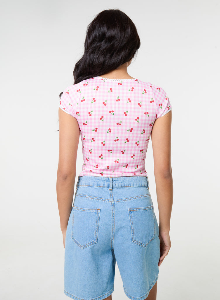 At Pink Vanilla we're in love with this cherry tee. Stay stylish and cute by wearing it with high waist denim cargo jeans and dad's trainers. Streetwear style approved!