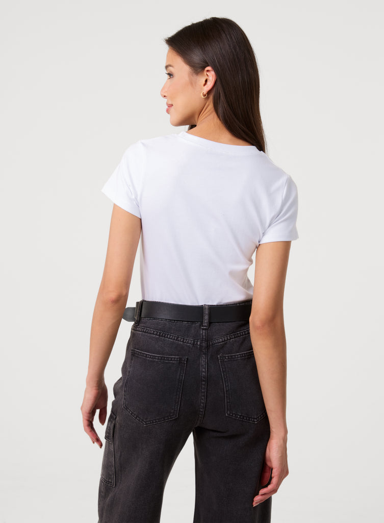 Bows are back in style and our diamante embellished short sleeve white T-shirt has been designed with exactly that in mind. It is cute and easy to add to your everyday wardrobe.