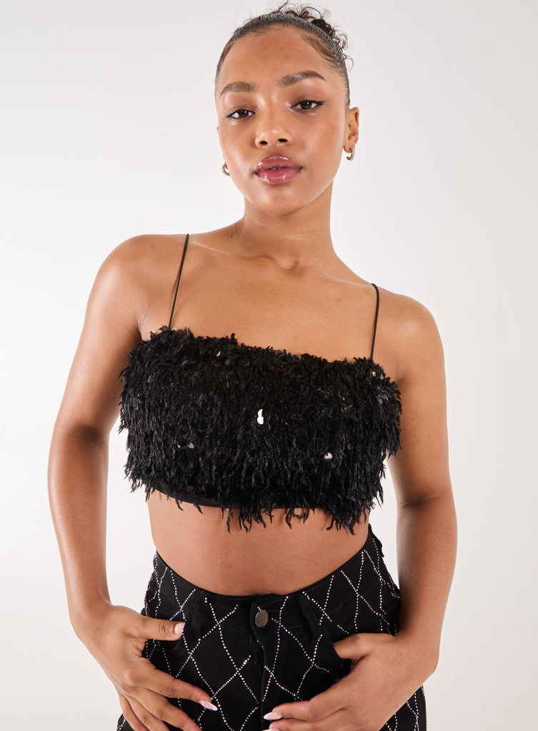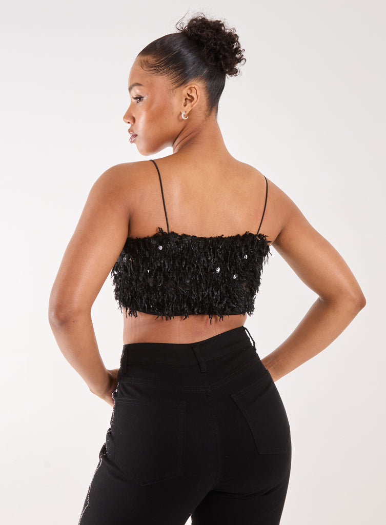 Elevate your partywear looks with this dreamy feather sequin cami top. This crop top is an absolute statement piece you want in your wardrobe now. Style it with our Diamante Jeans for a killer look or a leather mini skirt for a fun outfit.