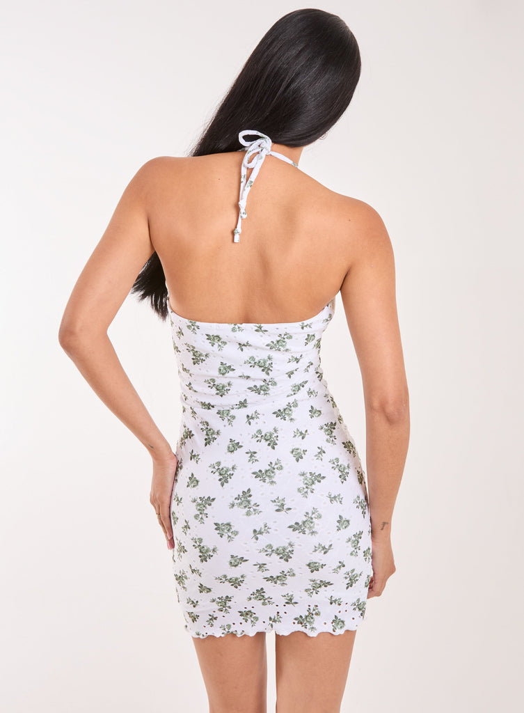 Feel cute in this floral broderie dress. Featuring an halterneck and figure-flattering design, this mini is your new season fave.