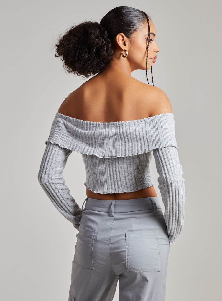 This Wide Brushed Ribbed Bardot Top combines long sleeves with a Bardot neckline that dramatically reveals the shoulders. This fitted top is in fine ribbed knit for extra comfort.