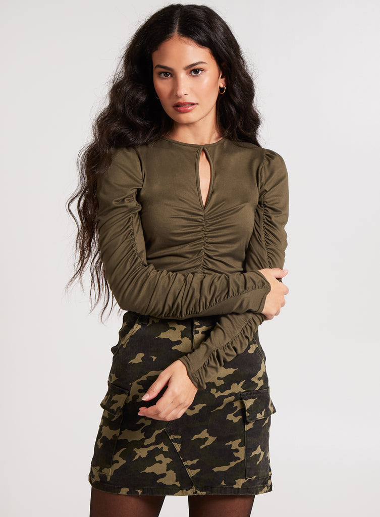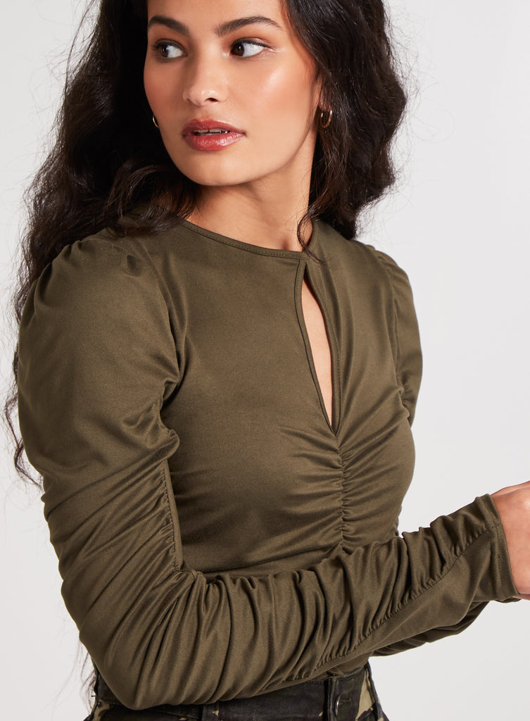 This crop top is sure to be a staple in your weekend wardrobe. Featuring a khaki green material with a keyhole cut out and ruched/ gathered design with long sleeves. We love it styled with vegan leather bottoms and a pair of strappy heels.