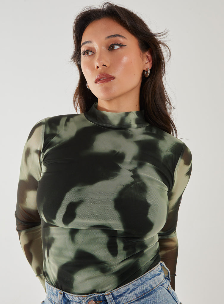 Your weekend outfit is sorted! Get ready to go out-out in this flattering Smokey Print Long Sleeve Mesh Bodysuit.
