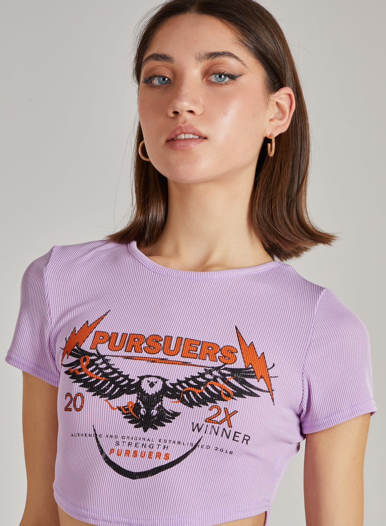 Add some bold hues to your everyday wardrobe with this crop top. Featuring a lilac contour rib material with short sleeves and a cropped fit, what's not to love? Wear with cargo bottoms and kicks for a chilled off-duty look.