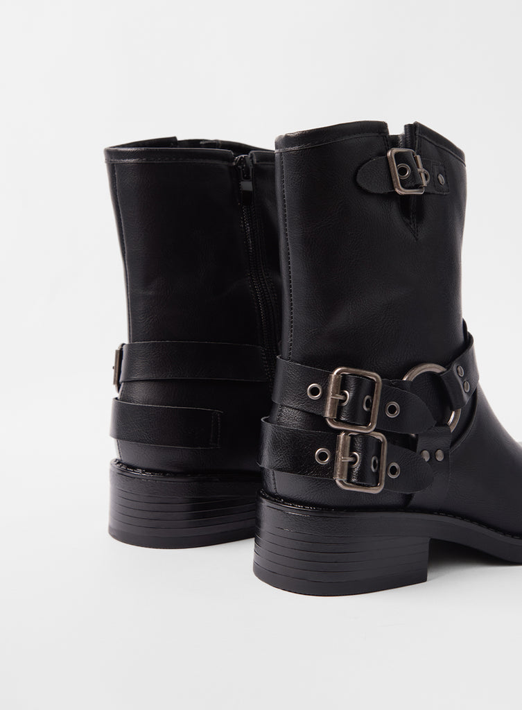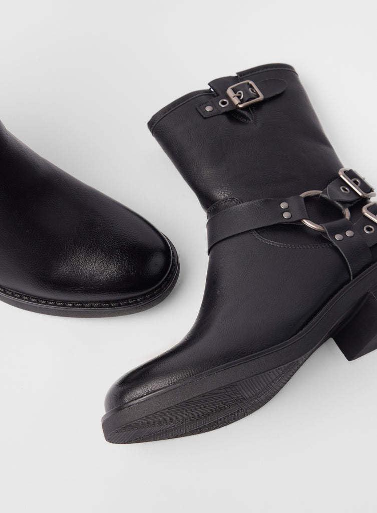 A chunky style for the cooler weather ahead, these leather-look biker boots with multiple buckles are comfy and hard wearing.