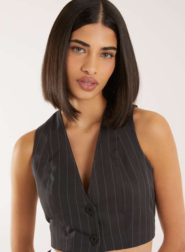We are in love with this pinstripe set. Mix and match our Pinstripe Cropped Waistcoat with: Boxer Style Pinstripe Trousers Bandeau Crop Top.