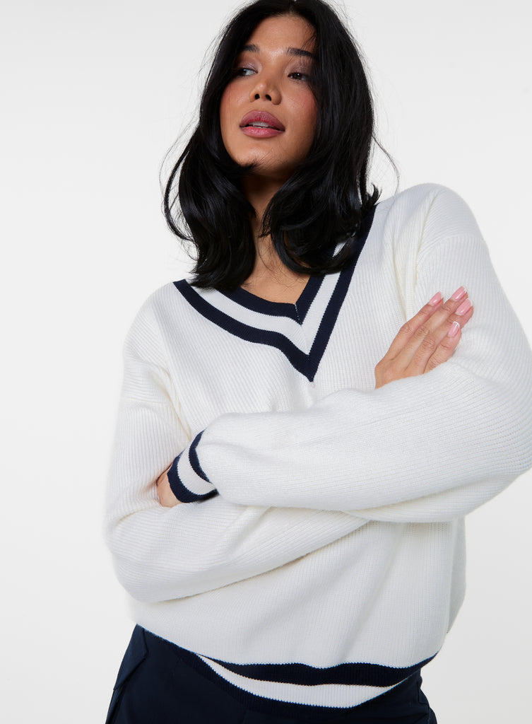 Step into total comfort with this Varsity V Neck Sweater. Perfect for winter cosy looks.