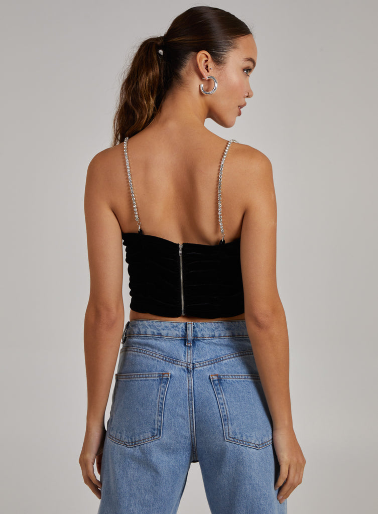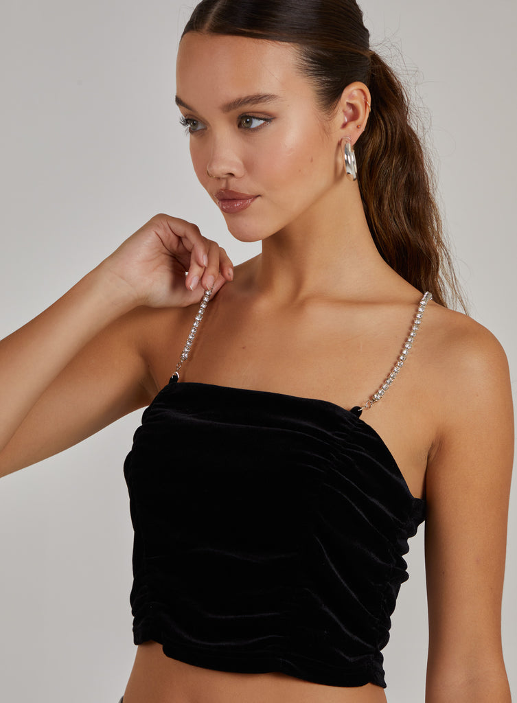 Get ready to dance the night away with our Velvet Rhinestone Straps Ruched Crop Top. With rhinestone straps detail, this top is all you need to make a statement this season. Whether you're off on a night out with the girls or you want something glam, we've got you covered.