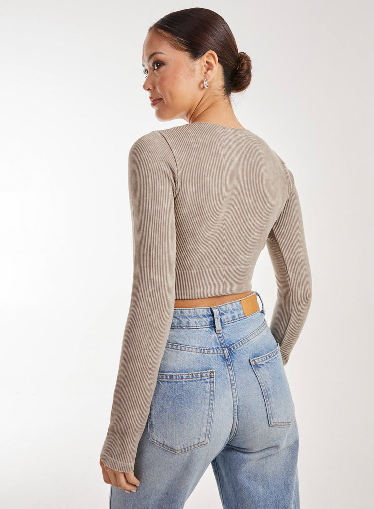 This cute top features a washed look and a ribbed fabric. It's perfect to style over denim jeans and off-white sneakers.