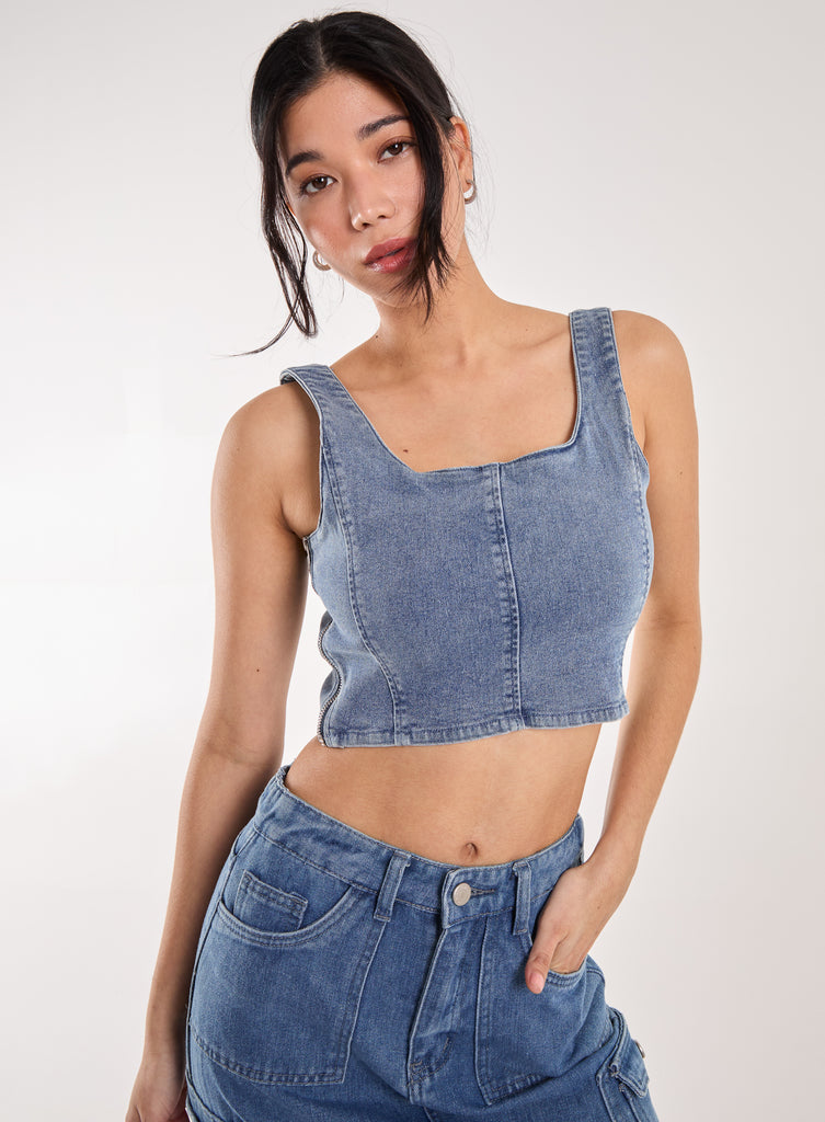 A denim corset top is a must-have for your summer wardrobe. Add this versatile cutie piece to your denim collection, style it on its own or layer it over a white tee.