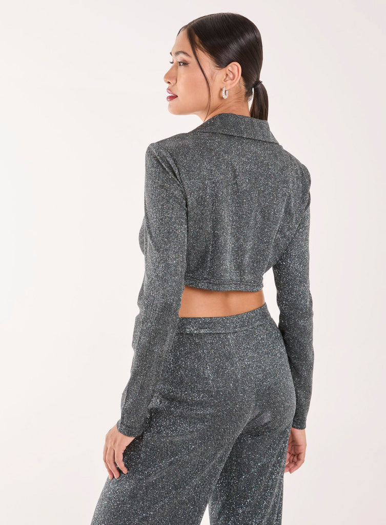 Get ready to party in this Glitter Cropped Blazer. Grab your girls and hit the dancefloor in the party 'fit of the season. Finish the look with our Glitter High Waisted Trousers.
